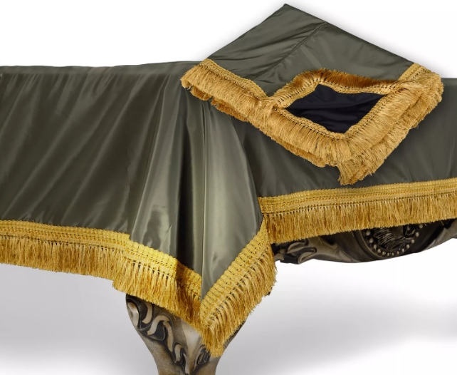 У нас представлены очень стильные декоративные покрывала для бильярдного стола. У такого покрывала зелёный цвет, а по краю оно украшено золотистой бахромой. Такое покрывало будет прекрасно смотреться в интерьере любого бильярдного помещения, будь то комната, ресторан или бильярдный клуб. Изготовлено такое покрывало из синтетического материала, который подбирается в соответствии с назначением. Он специально обработан влагостойкой пропиткой. Благодаря такой пропитке ткань будет отталкивать воду, также она будет более гладкой и плотной.