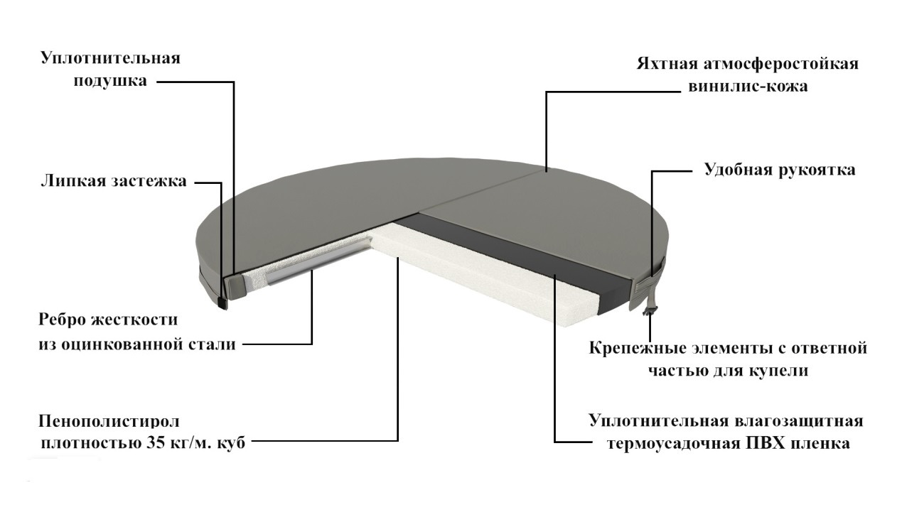 Предлагаем вам приобрести круглую термокрышку с треугольным вырезом для печи или лесенки. Такая термокрышка может быть выполнена в разных цветах, изготовлена она из пенополистирола с плотностью 35 кг/м3, он усилен ребром жёсткости в месте сложения. Наружный слой изготовлен из яхтного кожзама, у него повышенная устойчивость к разнообразным атмосферным воздействиям. Вес данной термокрышки может составлять 10-50 кг, а диаметр 100-500 см, высота 8 см.