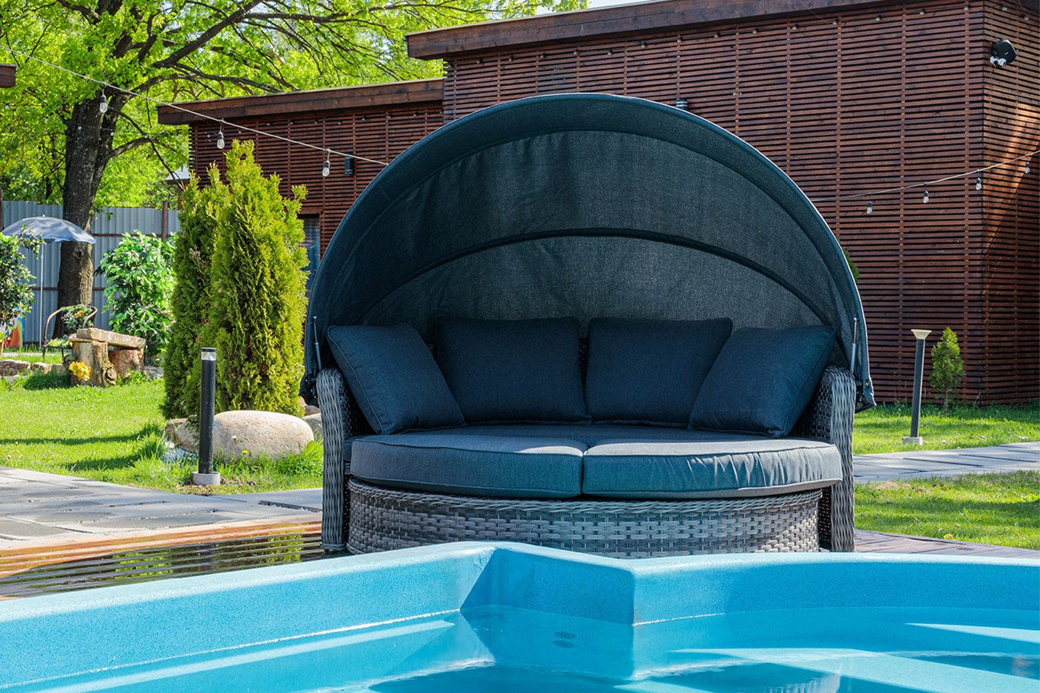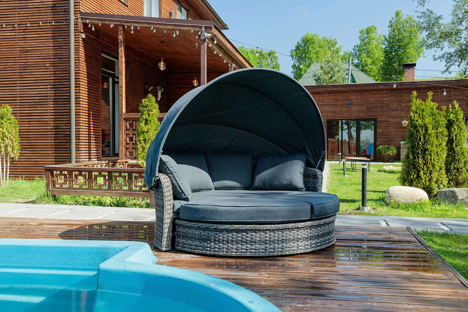 Шезлонг (диван-трансформер) из коллекции Виолетта – уникальная мебель для обустройства пространства для отдыха на природе. Диван может быть переделан в круглую кровать, для которой также можно будет добавить крышу.