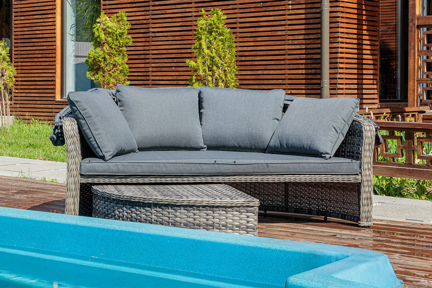 В полностью собранном состоянии такая мебель занимает пространство 195х74х195 см. Изготовлен диван из алюминия и искусственного ротанга, общий цвет конструкции – серый.